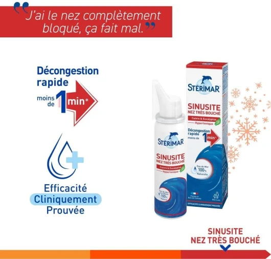 Débouchez votre nez en moins d'une minute et soulagez votre sinusite grâce au spray nasal Stérimar Sinusite Nez Très Bouché. Ce spray nasal est une solution hypertonique à base d'eau de mer 100% naturelle puisée en Baie de Cancale (Bretagne - France) et enrichie en cuivre, en huile essentielle d’eucalyptus et d'un complexe d'acides hyaluroniques.